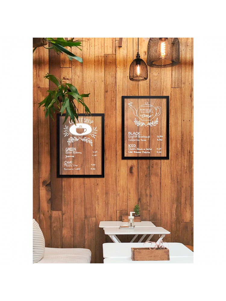 Quadro em madeira com superficie de escrita em vidro frente e verso. Fácil de limpar, resistente aos raios UV, arranhões e choques. Ganchos para pendurar e dois marcadores incluídos.
