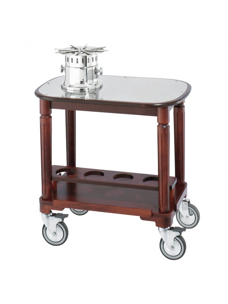 Mini Carro/Carrinho de serviço em madeira Flambé. Com 4 rodas sem travões. Andar superior em inox/aço inoxidável 18-10, acabamento em cetim. Andar inferior com suporte para garrafas.Ficha Informativa