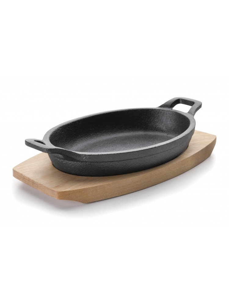 Caçarola oval em ferro fundido com 17,5cm de comprimento. Revestida com uma camada de óleo vegetal. Excelente condutor de calor, mantem a comida quente enquanto disfruta da sua refeição. Base de madeira para servir e apresentar a comida recém-preparada. Marca Lacor.