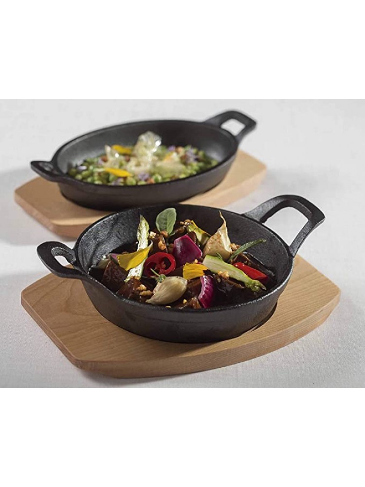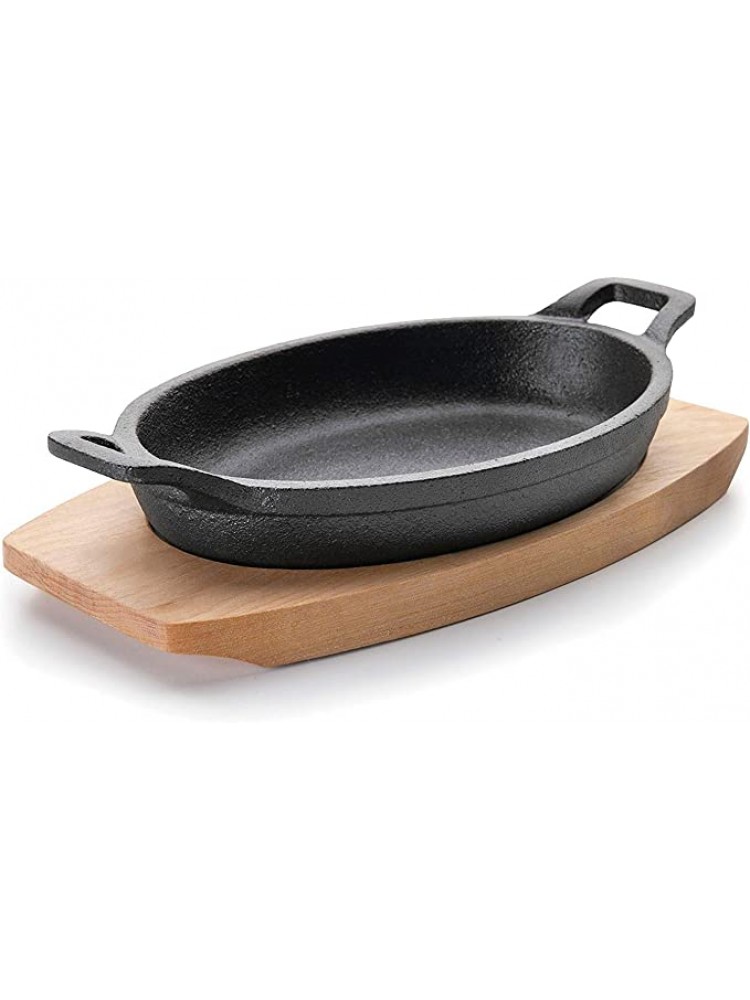 Caçarola oval em ferro fundido com 21,7cm de comprimento. Revestida com uma camada de óleo vegetal. Excelente condutor de calor, mantem a comida quente enquanto disfruta da sua refeição. Base de madeira para servir e apresentar a comida recém-preparada. Marca Lacor.