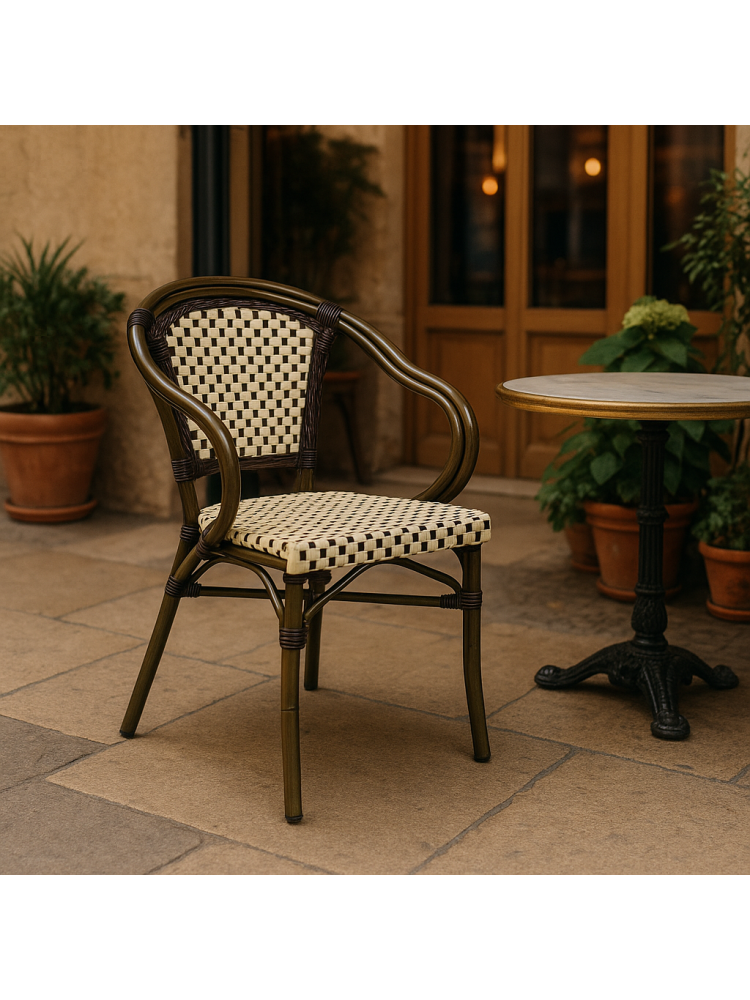 A Cadeira BRUSELAS combina elegância natural com funcionalidade moderna. Com estrutura em alumínio de 28x1,5 mm na tonalidade Dark Bamboo, oferece resistência e leveza com um acabamento que remete à textura da madeira natural.